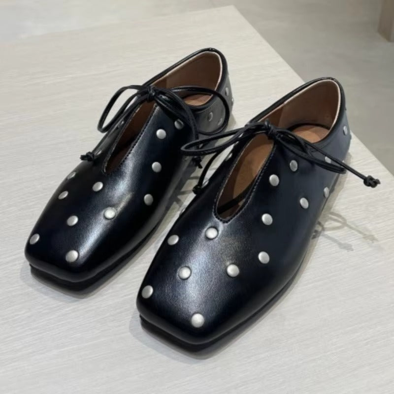 Descubre nuestras bailarinas estilo derby, adornadas con pequeños y refinados remaches. Ligeras y cómodas, estas bailarinas son perfectas para añadir un toque de estilo a cualquier conjunto. Ideales para un look diario y versátil, te ofrecerán comodidad sin renunciar a la elegancia. ¡Un imprescindible en cualquier armario!