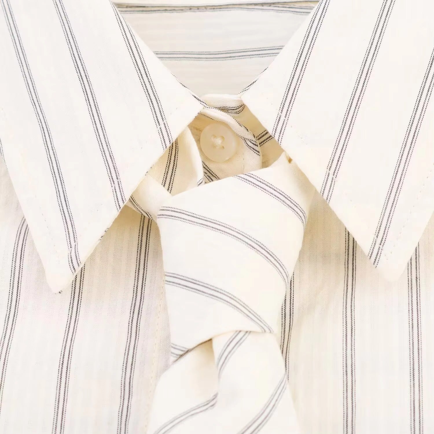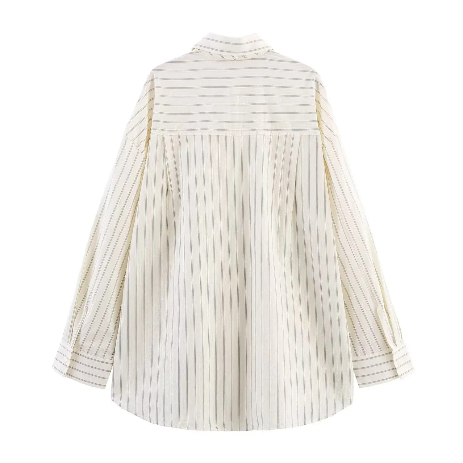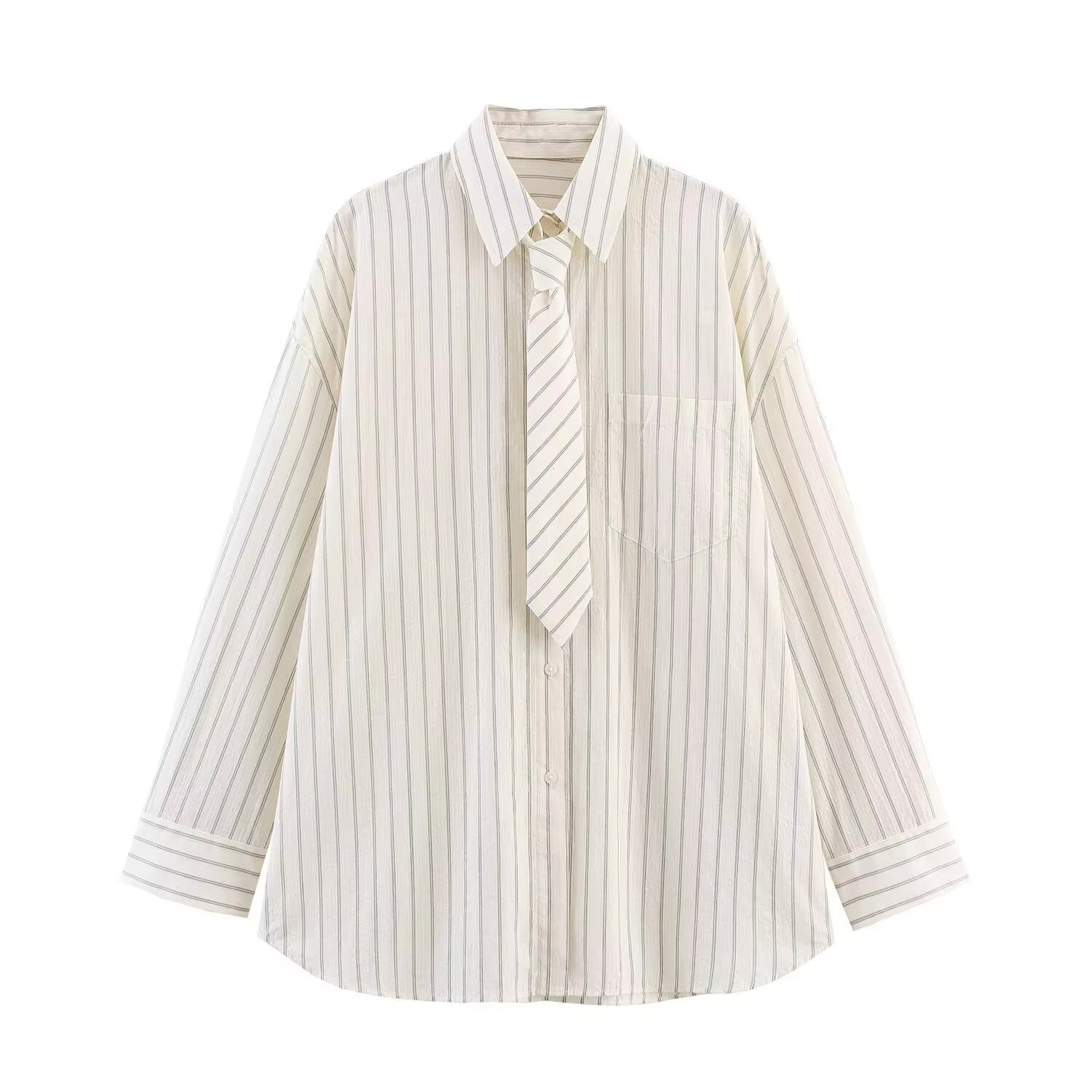 Elegante y moderna, esta camisa oversize es un imprescindible para tu guardarropa. Confeccionada en un tejido ligero color crema, presenta un sutil estampado de finas rayas verticales en tono gris claro que estiliza la figura. Incluye una corbata a juego para un toque sofisticado y chic. Perfecta para un look casual, de oficina o para superponer capas. ¡Combínala con jeans o faldas para un estilo versátil!
