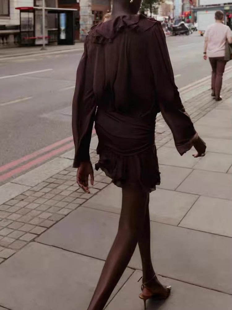 Descubre la elegancia y versatilidad de esta prenda en color marrón chocolate. Con un escote en V profundo adornado con un delicado volante (volante fruncido), esta pieza destaca por su movimiento y sofisticación.