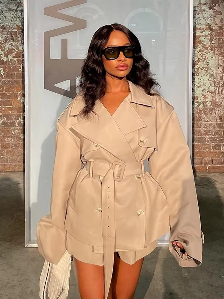 Elegante gabardina corta beige, con doble botonadura y cinturón para una silueta definida. Las mangas amplias añaden un toque de refinamiento. Perfecto para combinar con sus pantalones cortos para un look chic y versátil.