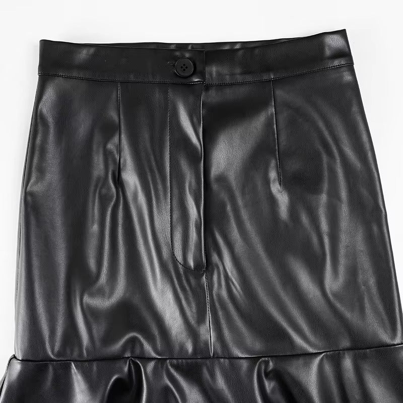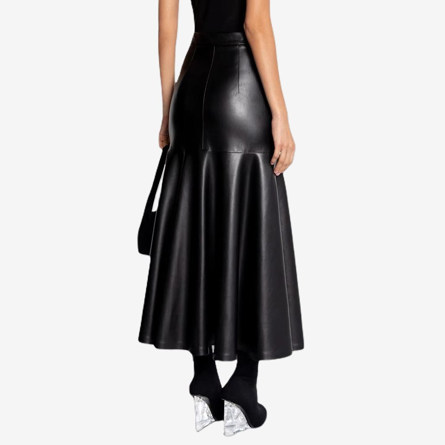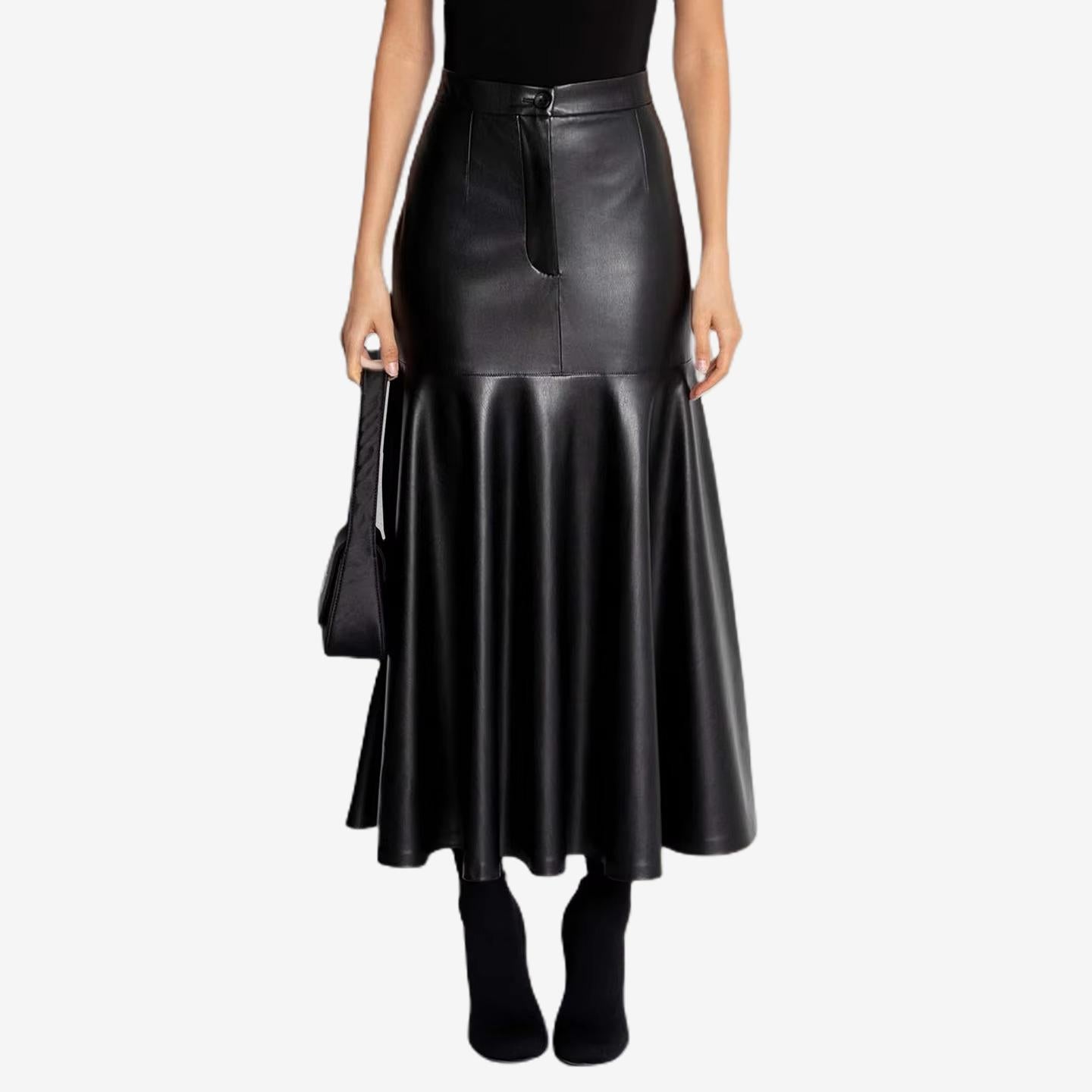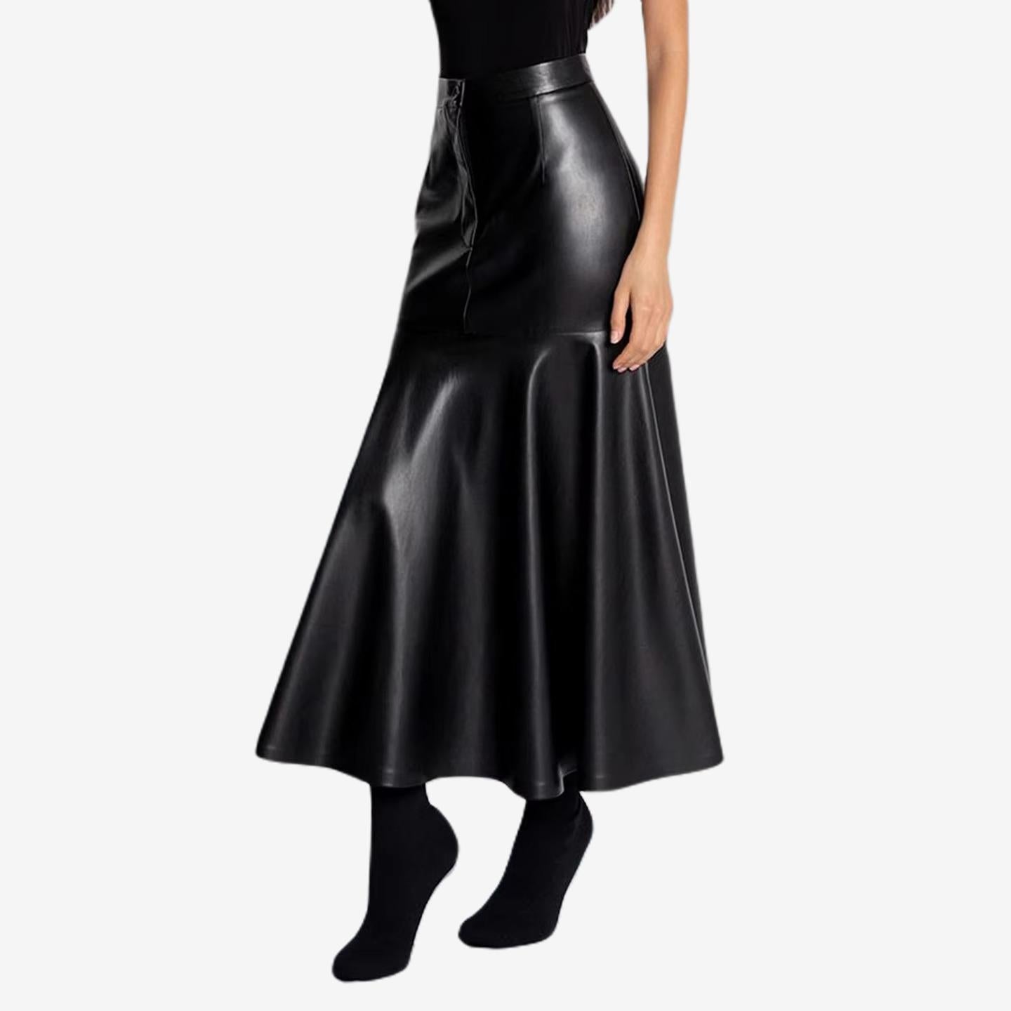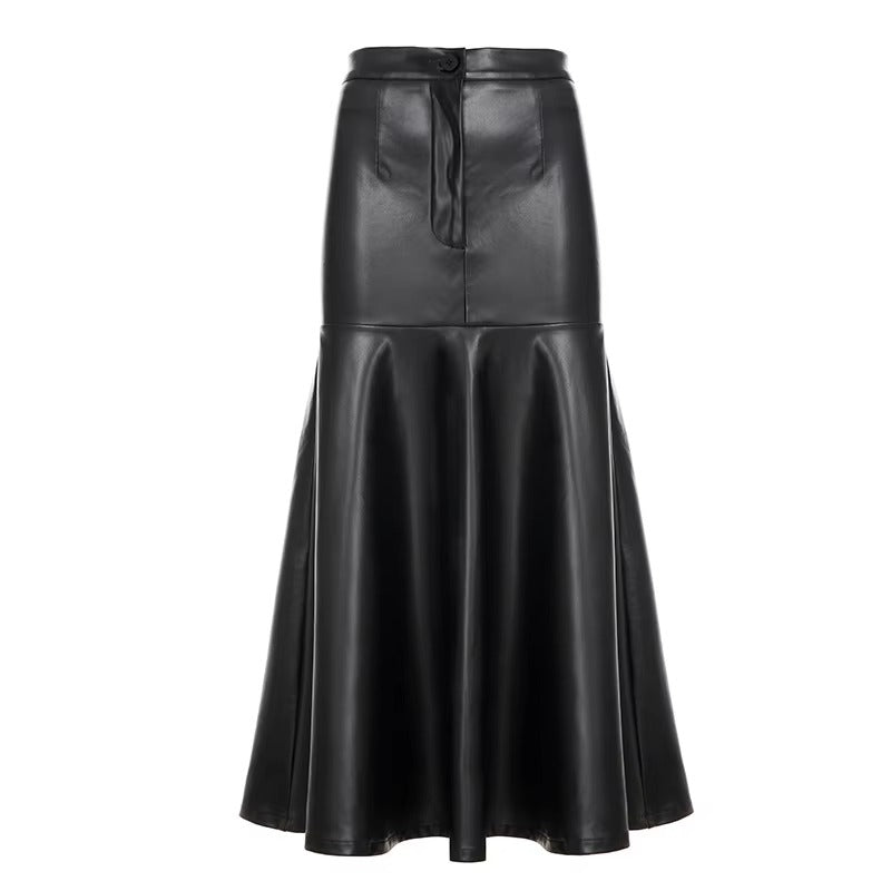 Añade un toque audaz y elegante a tu armario con esta falda larga de polipiel (cuero sintético) de corte sirena. Su tejido de alta calidad imita perfectamente la piel, ofreciendo un look sofisticado y moderno a la vez que es fácil de cuidar. Talle alto y silueta ajustada que se ensancha en el bajo para un movimiento espectacular. Ideal para looks de noche o para un estilo diario con carácter.