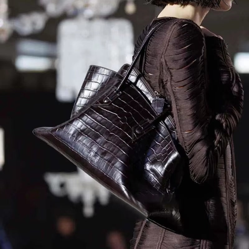 Este versátil bolso tote se convertirá en tu accesorio esencial para el día a día. Su diseño elegante y estructurado ofrece una impresionante capacidad de organización gracias a sus tres amplios compartimentos: uno central con cierre de cremallera (zip) para mayor seguridad y dos compartimentos laterales abiertos. Confeccionado en un lujoso acabado que imita la piel de cocodrilo, es perfecto para llevar todo lo que necesitas con estilo.