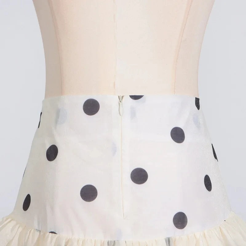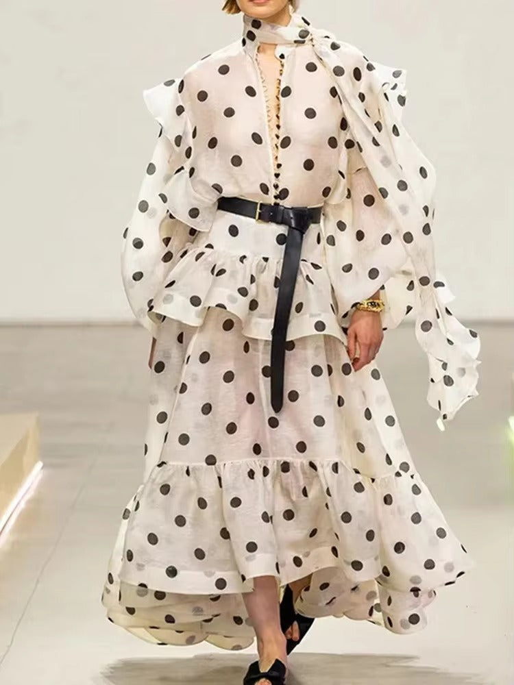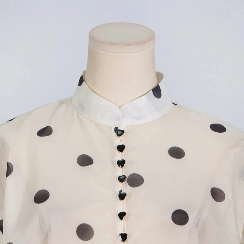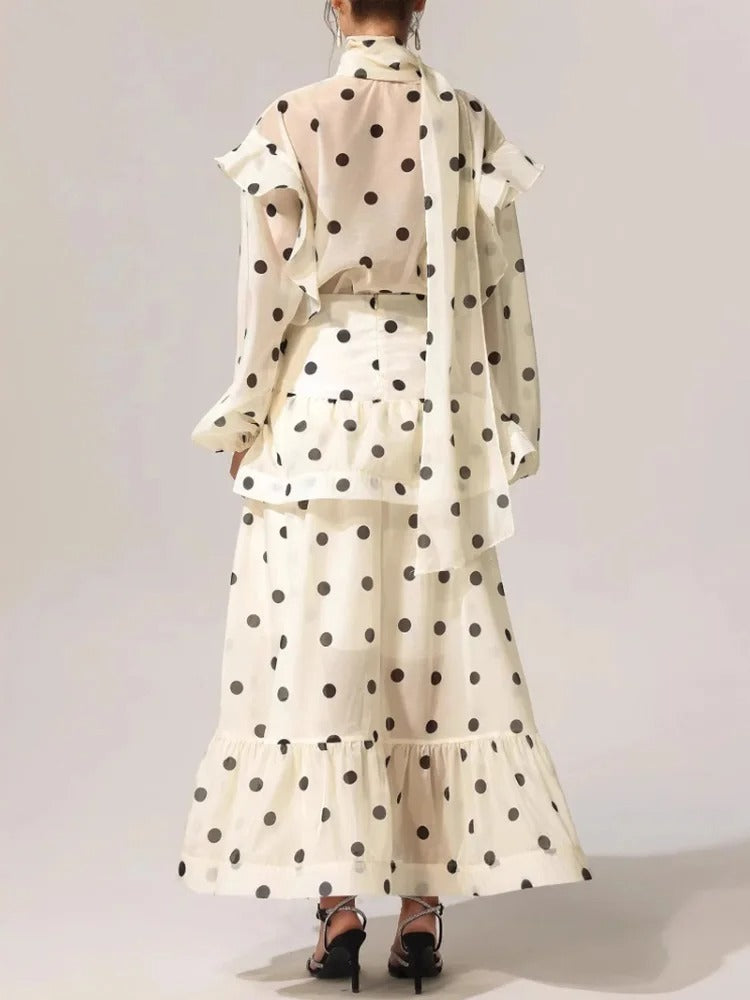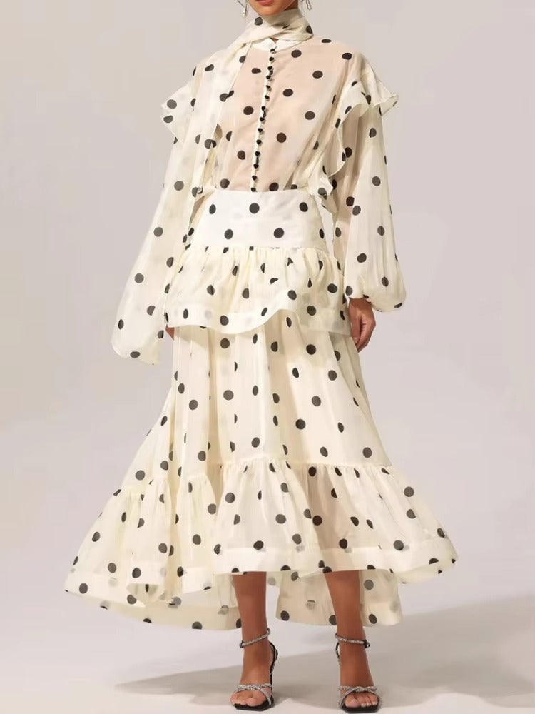 Descubre nuestro sofisticado conjunto blanco con lunares, perfecto para quienes buscan un look elegante y moderno. Este conjunto, compuesto por una camisa de manga larga y una falda midi, está confeccionado en un elegante y suave voile. La camisa presenta un precioso detalle de pañuelo incorporado en el cuello, que le añade un toque de originalidad, junto con los bonitos botones en forma de corazón que aportan un encanto adicional a tu outfit. La falda, con cintura alta, estiliza la silueta y presenta un corte asimétrico que crea movimiento y dinamismo. Perfecto para ocasiones especiales o para un look refinado en el día a día, este conjunto te permitirá expresar tu personalidad con estilo. Combínalo con tacones altos o sandalias elegantes para un look impecable en cualquier ocasión.